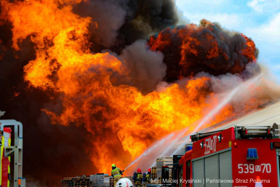Wielogodzinna walka z żywiołem, ogromne zadymienie widoczne z wielu kilometrów i zaangażowanie sił z dwóch powiatów – tak wyglądała akcja gaśnicza w miejscowości Łomna (powiat nowodworski). Ogień niemal całkowicie strawił halę magazynową należącą do hurtowni spożywczej.
